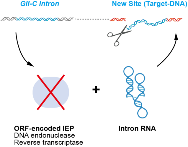 HYER源自细菌逆转座子(第二类内含子,GII intron ),一种可在宿主基因组上“拷贝和粘贴”(逆转座)的可移动元件。该元件通常编码一个兼具核酸酶和逆转录酶活性的蛋白质,以及一个RNA分子,通过形成蛋白核酸复合物(RNP)来执行在宿主基因组中的逆转座扩增。有趣的是,通过广泛的生物信息学筛选,刘俊杰(Jun-Jie Gogo Liu)课题组发现了许多不编码蛋白的、紧凑的二类C型内含子(ORF-less GII-C intron)在细菌基因组中存在多拷贝的现象。这一现象暗示,这些内含子编码的唯一组份,RNA分子,可能具有不依赖蛋白的扩增位点识别和切割能力,来实现内含子在宿主基因组内的拷贝扩增。