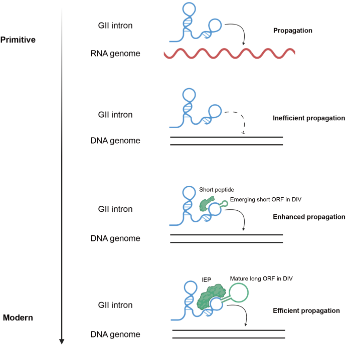 有趣的是,受“RNA世界”假说的启发,研究人员提出了第二类内含子中的“RNA的催化功能逐渐被蛋白质取代”的分子进化历程:在进化过程中,第二类内含子的结构域IV逐渐扩大,并产生了可编码短肽的开放阅读框(ORF),而这些短肽可作为顺式元件与内含子RNA相互作用,增强其结构稳定性和催化活性;随着ORF变得更长,更为成熟,其编码的蛋白质不仅起到稳定结构的作用,亦获得了DNA切割和逆转录活性,以替代RNA核酶行使催化功能。该成果不仅拓展了科学界对“RNA世界”假说和RNA催化功能的理解,也为创制具有我国完全自主知识产权的新型核酸操纵底盘工具,用于基因编辑和RNA编辑等,奠定了基础。