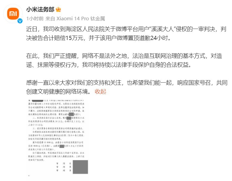 鞭牛士 2月9日消息,今日,小米法务部发文表示,近日,收到海淀区人民法院关于微博平台用户「溪溪大人」侵权的一审判决,判决被告合计赔偿15万元,并于该用户微博置顶道歉24小时。