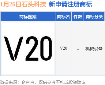 证券之星消息,根据企查查数据显示,近日北京石头世纪科技股份有限公司新提交“V20”商标注册申请。商标申请详情如下:
