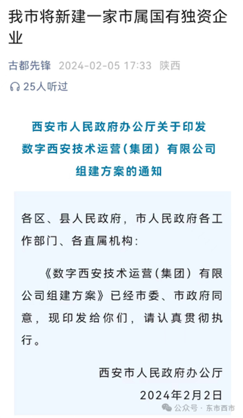 2月5日,西安市委组织部微信公众号《古都先锋》刊发资讯,西安市将新建一家市属国有独资企业。文章显示:西安市政府已于2月2日正式印发并下发了《数字西安技术运营(集团)有限公司组建方案》(以下简称方案)。一家超大型,以数字技术、平台和服务等为主营业务的超大型国有独资企业即将在大西安浮出水面。