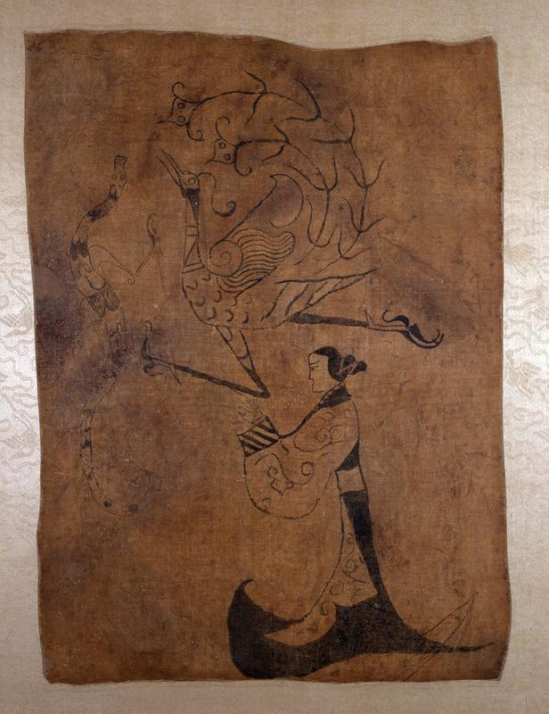 龙不仅仅可以穿梭于深渊、云天等不同的空间,也同样可以穿梭于不同的生命时空,指引和带领人们的灵魂进入鬼神之界,寄托和映射着古人的宇宙生命观。在湖南博物院的藏品中有两幅长沙地区楚墓出土的珍贵帛画(帛画多为丧葬中使用,被认为是楚地出殡时作为前导,入葬时则置入椁中的“魂幡”。因此,帛画中所绘内容往往与墓主人灵魂升天的身后场景有关),其中都有龙的形象。长沙子弹库楚墓出土的《人物御龙帛画》中,一名男子头戴高冠,腰间佩剑,身着博袍,头顶华盖,华盖的结穗和下颚处的长缨向后飞动,显示出一种迎风前进的速度感。正是他身下的龙带着他飞速前进:龙身弯曲成舟形,矫首昂视,似乎正引领主人公前往另一境界,使人想起《庄子·逍遥游》中的“乘云气、御飞龙”之语。长沙陈家大山楚墓出土的《人物龙凤帛画》中则描绘了一位衣着华丽的贵族女子,侧身合掌立于一弯月形物上,其上有凤鸟和神龙飞舞。这两幅帛画与马王堆汉墓出土的T形帛画功能类似,都描绘了主人公灵魂飞升的相同主题,但T形帛画画面更为宏大,两条对称的巨龙尤为显眼:它们穿过一块硕大的玉璧,蜿蜒的身躯跨越着人间与地下的世界,缠绕的身体和大张的巨口彰显出非凡的灵物之力,代表着墓主生命形态的转化和延续。在巨龙的烘托下,整幅画面显得如此奇诡迷幻又如此磅礴恢弘,充满着楚地艺术令人着迷的魅力。