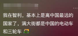 更夸张的是,有网友说,几乎离中国最远、横跨整个太平洋,航运都需要一个月的智利,竟然满大街也都是中国的电动车和三轮车。