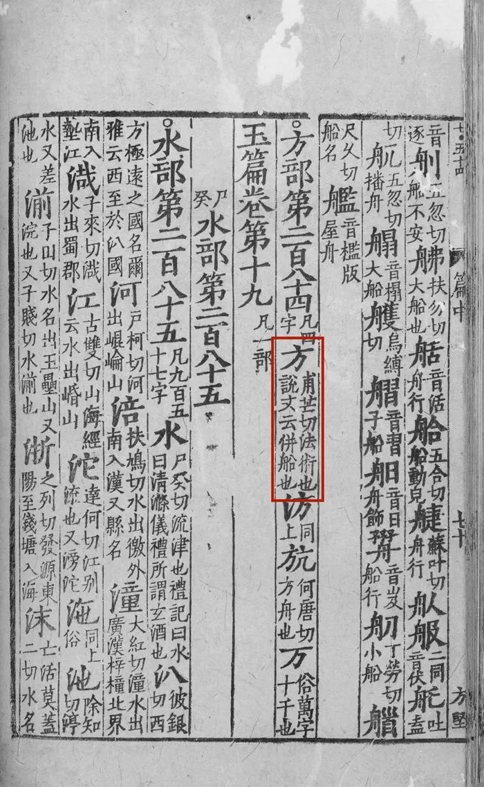 《玉篇》由“原本”到“宋本”,发生了巨大的变化。首先是删除了大量的释义书证,比如“方”字,原本《玉篇》标出读音“甫芒反”,之后引证《周易》《尚书》《毛诗》《周礼》《礼记》《左传》《论语》《国语》《史记》《说文》《广雅》等书的故训资料,释义长达500余字(图2),但到了宋本《玉篇》里,只剩12个字:“甫芒切。法术也。《说文》云:‘併船也。’”(图3)