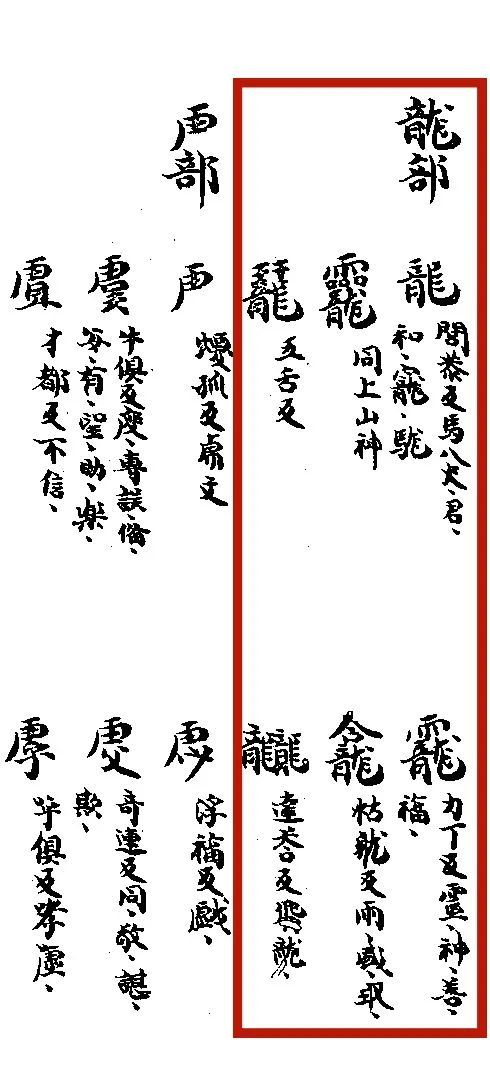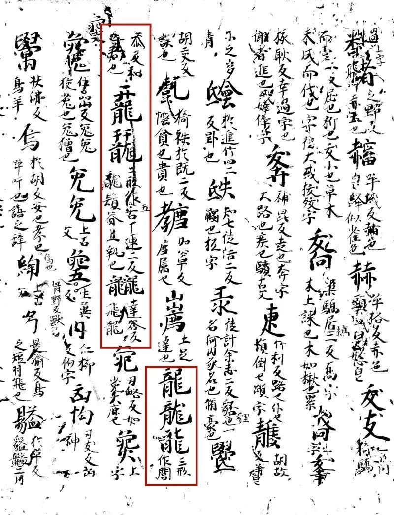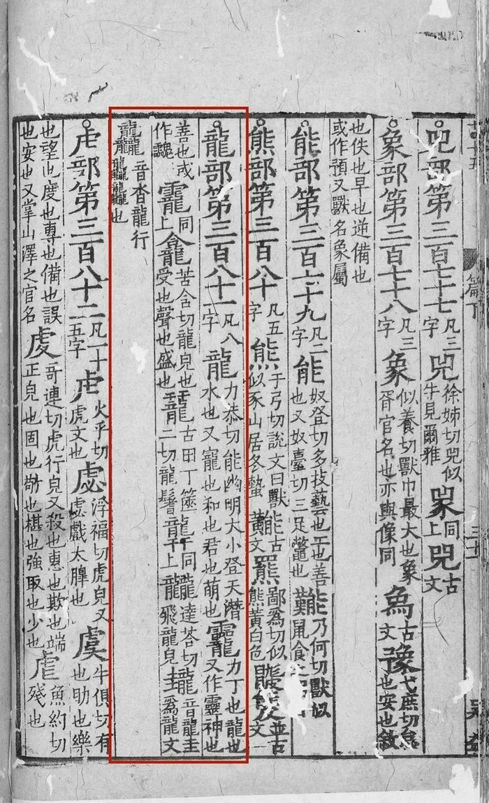 遗憾的是原本《玉篇》“龙”部残缺,似乎无从探晓原本有没有“龘”字,但其实是可以推考的。公元8世纪左右的日本学者空海,曾据原本《玉篇》等材料编纂过一部中文字书《篆隶万象名义》,是日本现存最古老的辞书。通过与原本《玉篇》残卷对应部分的比较来看,《篆隶万象名义》的部目次第与原本《玉篇》完全吻合,几乎就是原本《玉篇》的删节版。《篆隶万象名义》“龙”部收字6个,最后一字是“龖”,不仅没有收宋本《玉篇》“龙”部最后一字“龘”,连“龘”字前面的一个字“