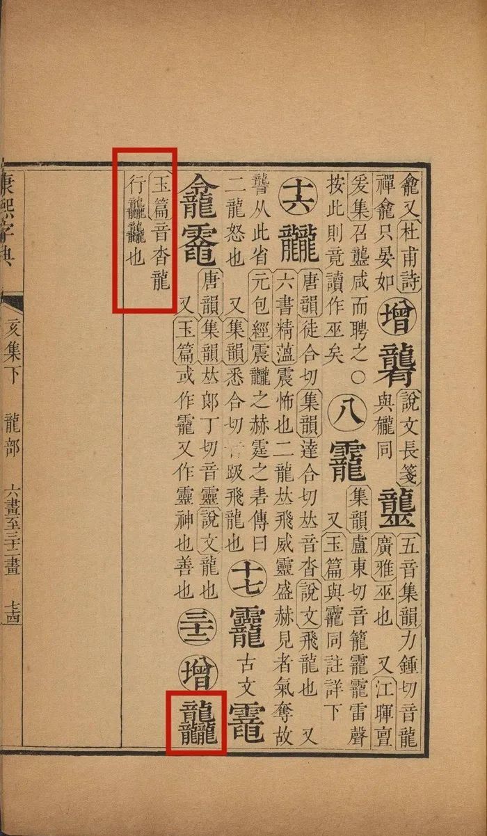 回到《玉篇》卷二十三“龙”部来看,宋本共收字9个,最后一字是“龘”,《康熙字典》引《玉篇》“音沓,龙行龘龘也”,正源于此。(图4)