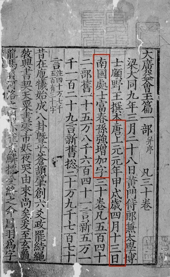 因此,我们认为“龘”字并不见于梁代顾野王编纂的《玉篇》。那“龘”字是什么时候增入《玉篇》的呢?遍检传世典籍,在北宋以前“龘”并没有文献用字。《大广益会玉篇》的序言中提到“唐上元元年甲戌岁四月十三日,南国处士富春孙强增加字”(图7),如果这个记载属实,那就是说宋本《玉篇》的新增字很多都是唐代孙强增入的,“龘”字被增入《玉篇》的时间上限最早可能是唐代,当然也不排除是到了北宋重修《玉篇》时才被增入的。