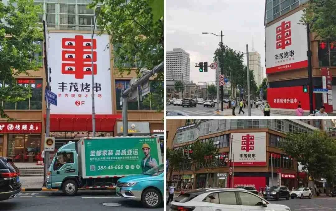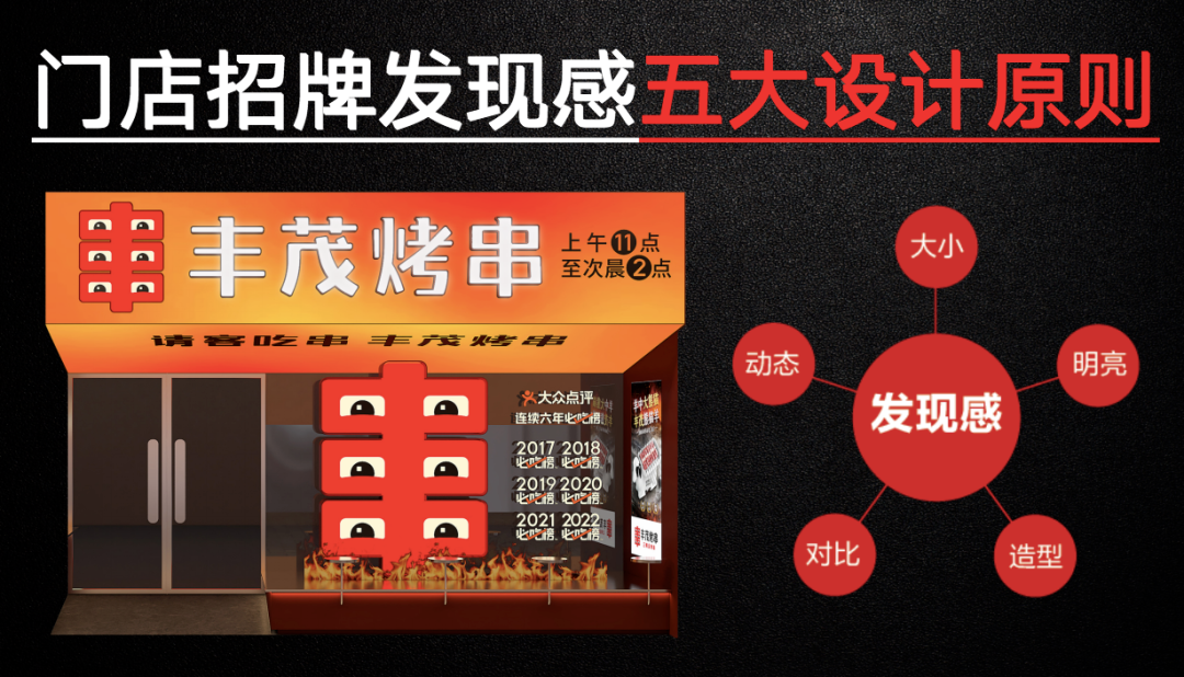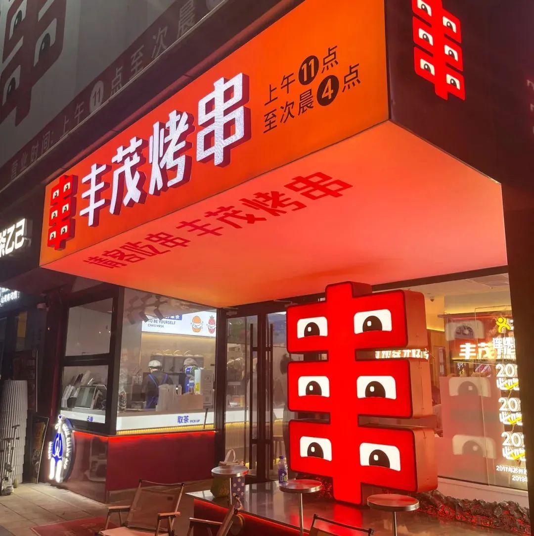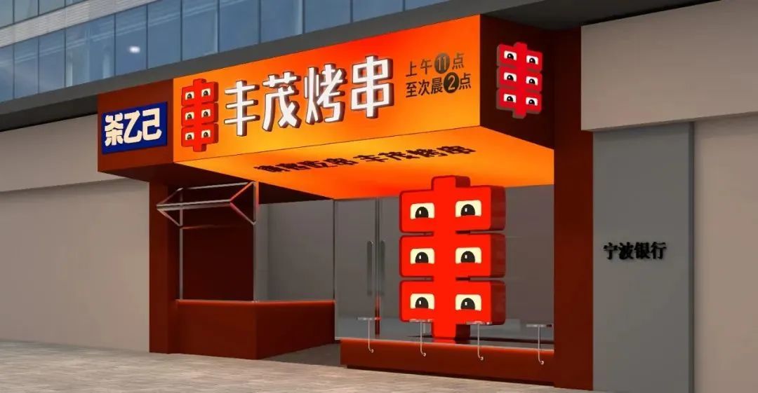 而且,“丰字串”超级符号还被运用到门店设计上。从“大小、明暗、造型、对比、动态”的五大招牌设计原则入手,对丰茂烤串门店的外立面进行了重新设计。