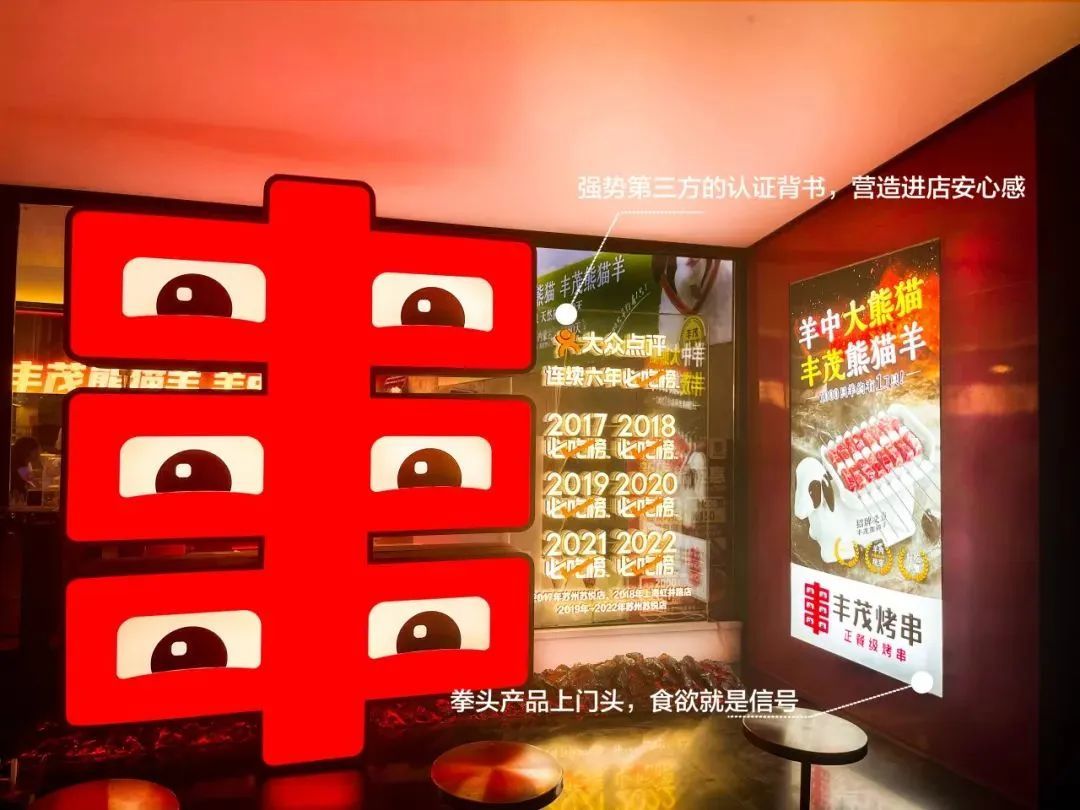 华与华为“丰字串”添加了视觉强制性最强的符号——眼睛,“丰字串”的刺激信号能量就会得到几何级的放大;通过这个创意,将“串”字注册成了品牌资产,为丰茂烤串摘取了烤串行业里面唯一的王者符号。