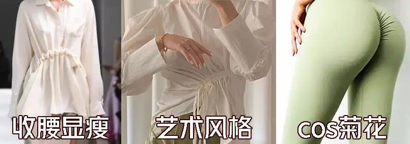 下装腰身处的“松紧带”虽然和“菊花褶皱”外观差距较大,但原理相通。穿过这种下装的朋友,应该体会过松紧带失去弹性或断掉时,全程手提裤子(裙子)的窘境。因此,现代不少下装在松紧带的基础上,会增加一条抽绳当保险。