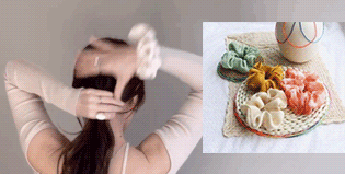 在弹力极强的皮筋外套上一层弹力较差、面积较大的布料,缝合之后就是女生爱用的“大肠发圈”。