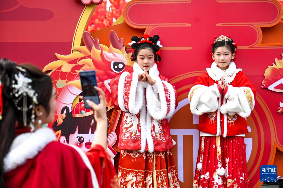 2月12日,在江西省南昌市滕王阁景区,小朋友身着节日服装拍照留影。