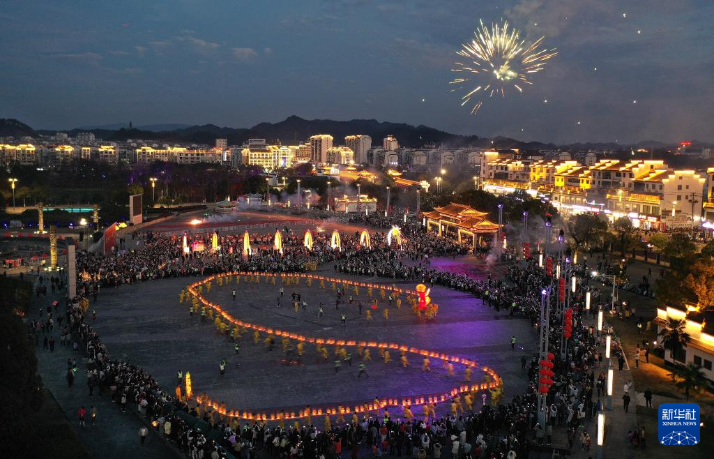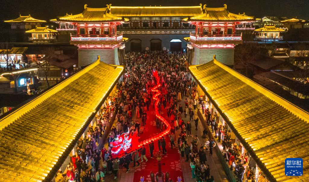 2月12日,游客在湖北省襄阳市唐城景区观看板凳龙灯巡游表演(无人机照片)。