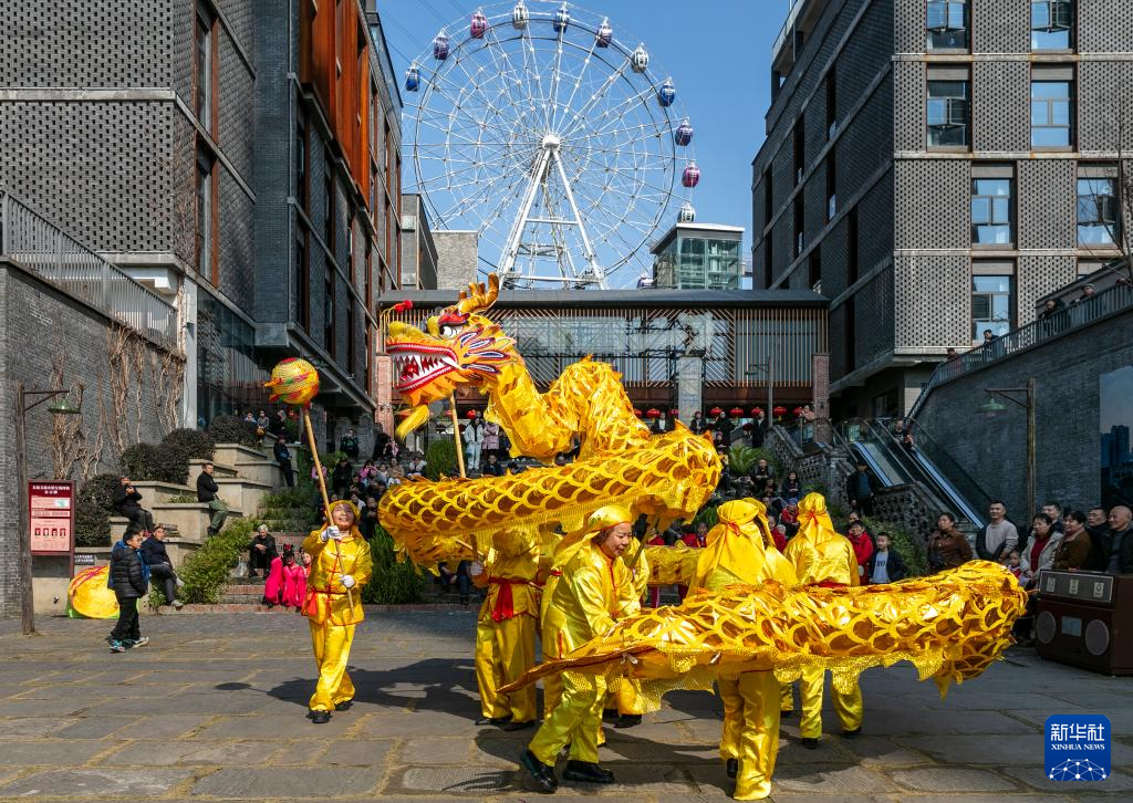 2月12日,市民在重庆市南川区东街古镇观看舞龙表演。