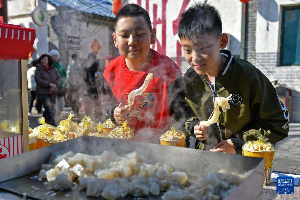 2月13日,两名小朋友在山东省烟台市芝罘区一处文化街区品尝特色小吃。