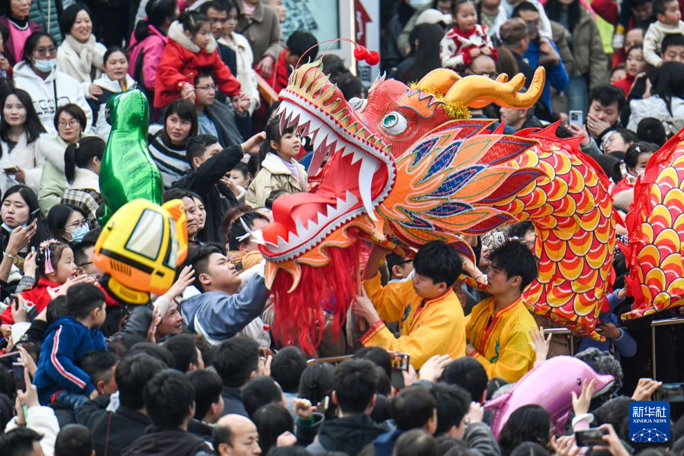 2月12日,在江西省南昌市西湖区万寿宫历史文化街区,游客与板凳龙演员互动。