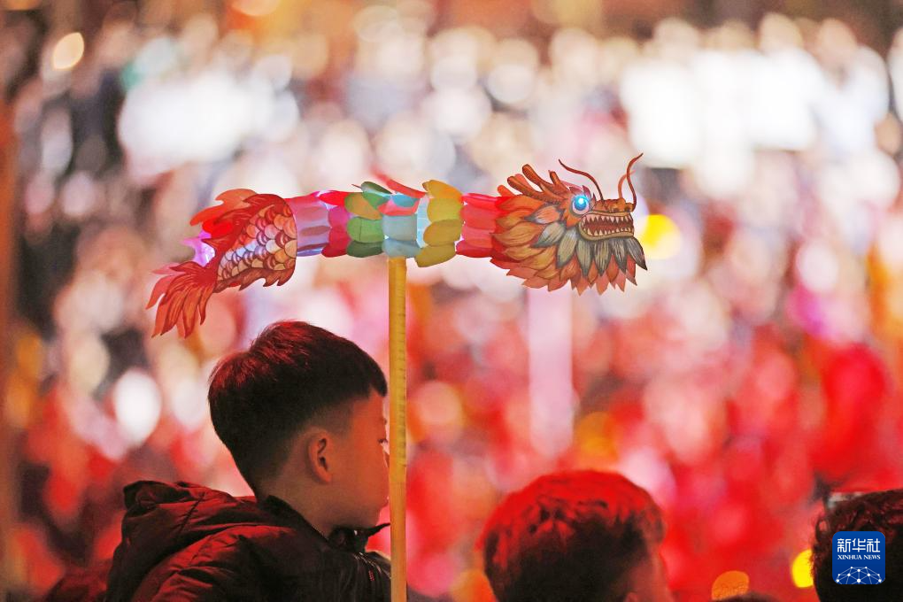 2月12日晚,在山东省临沂市郯城县郯国古城春节大庙会上,一名小男孩拿着玩具龙看表演。