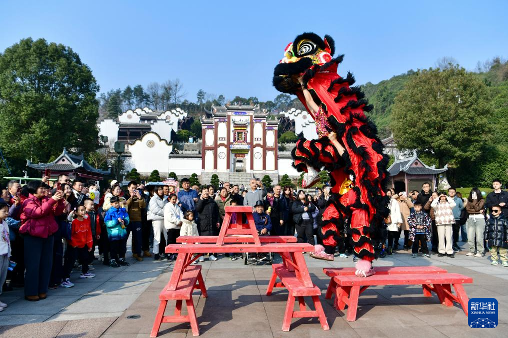 2月13日,在湖北省宜昌市秭归县屈原故里文化旅游区,非遗传承人和民间艺人为当地居民和游客表演舞狮。