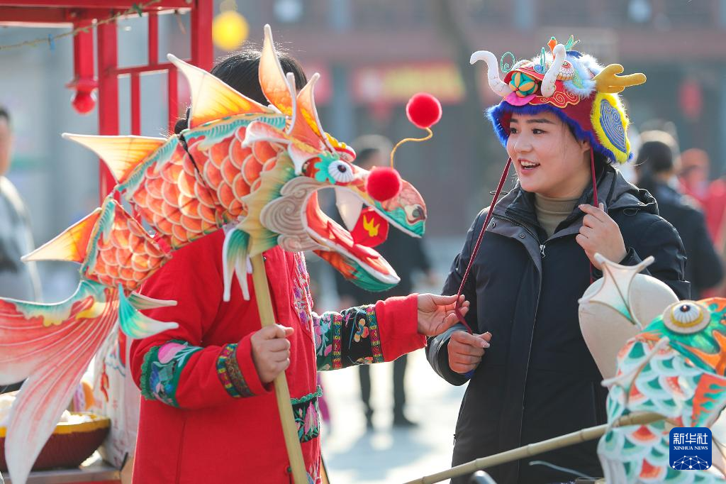 2月13日,游客在河南商丘古城年货大集上购买龙帽。