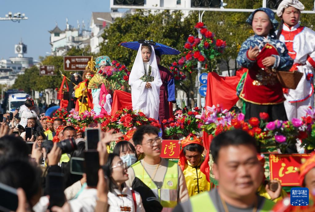 2月12日,在江西省婺源县举办的“婺源非遗贺新春”巡游展演活动中,演员在进行巡游展演。