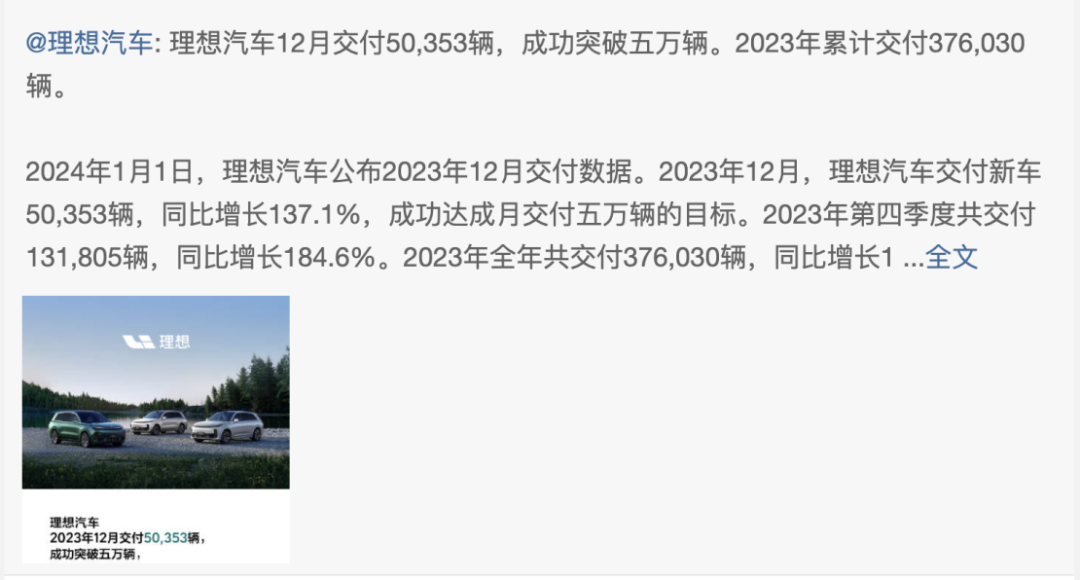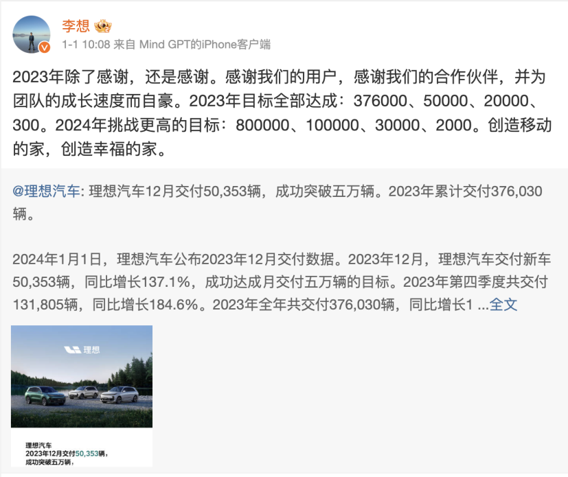 2024年开年,理想汽车公布了一份抢眼的成绩单。