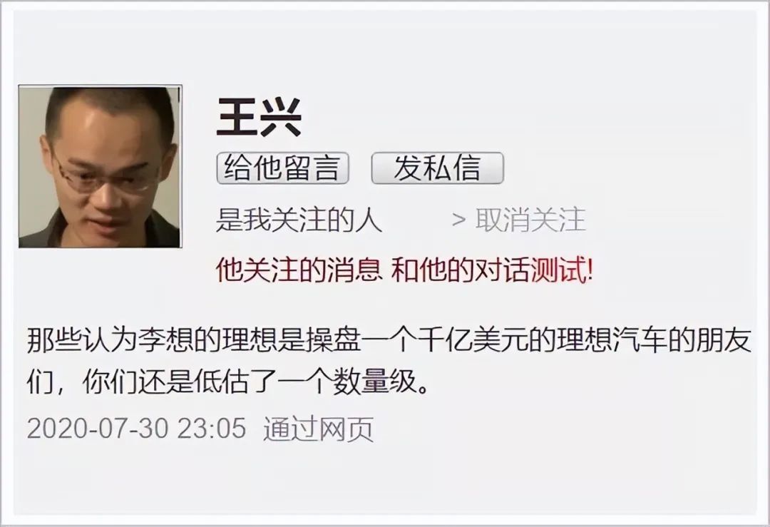 2020年7月30日,理想汽车上市那晚,王兴在饭否发布了一条动态: