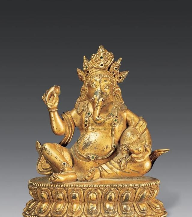 象头王财神,也称“象鼻天”或“障碍神”,是毁灭及再创之神湿婆(佛教称为大自在天)和化身十六的雪山女神的长子,他原名俄尼沙,梵名为那钵底,译作大圣欢喜天,简称为圣天。象头王,顾名思义,象头人形,鼻长目广,寂静相。奇怪的是,他有一面四臂、两臂、十二臂等身像。其一面四臂身形,左二手持钺斧与天妙果,右二手持数珠与萝卜,足蜷右曲作,舞立姿踏于一只硕鼠之上。其十二臂身形,左臂分持骷髅杖、盛血颅碗、盛人肉颅碗、杵、弓、三叉戟各种法器,右臂分持箭、钩、斧、剑、金刚杵、矛,左足蜷曲,也舞立姿踏于一只硕鼠之上。