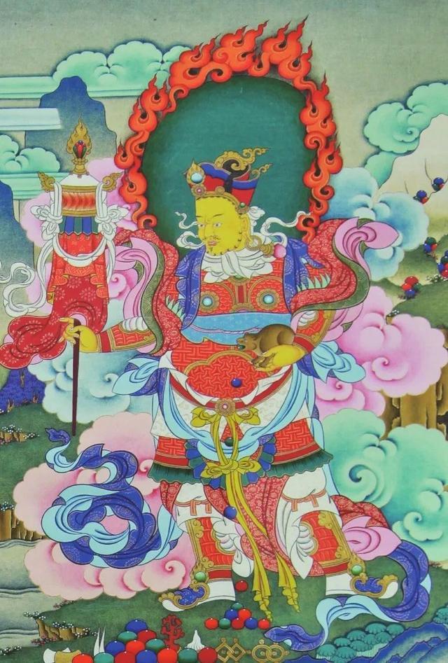 五姓财神中,黄财神最为常见,一般呈矮壮愤怒金刚形象,以手中托“吐宝白鼬”为最直观的辨识依据。黄财神是从四大天王的多闻天王分化而出的,他的身、口、福业、意、功德等又化身成五色财神,即白财神为身、红财神为口、黑财神为福业、黄财神为意、绿财神为功德化身,而黄财神是集所有财神的化现总合。