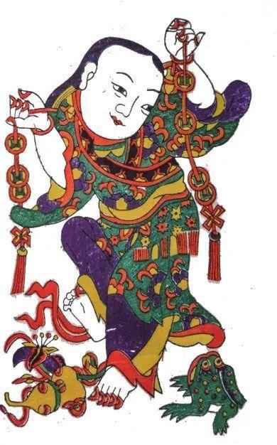 清孟籁甫的《丰暇笔谈》中有关于“刘海戏金蟾”的叙述:刘海“汲井得三足大蟾蜍,以彩绳数尺系之,负诸肩上,喜跃告人曰:‘此物逃去,期年不能得,今得之矣。’于是乡里传述……争往看之,至拥挤不得行”。此外,清初《坚瓠集》中也有记载:刘海戏蟾,举世无不知其名者,今画蓬头跣足嘻笑之人,即刘海也,持三足蟾弄之。除了民间年画和剪纸外,民间舞中也出现过刘海以金钱戏三足蟾的表演,人们竞相观摩,引以为吉祥之兆。