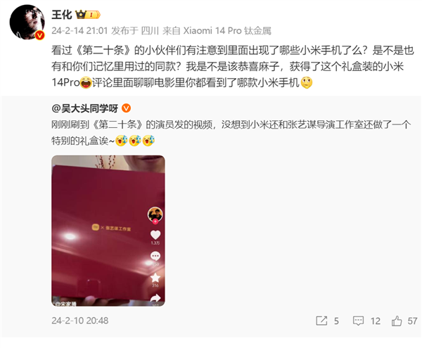 王化还在此条微博询问网友:“看过《第二十条》的小伙伴们有注意到里面出现了哪些小米手机了么?是不是也有和你们记忆里用过的同款?聊聊电影里你都看到了哪款小米手机”。