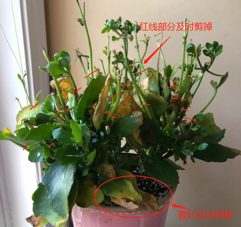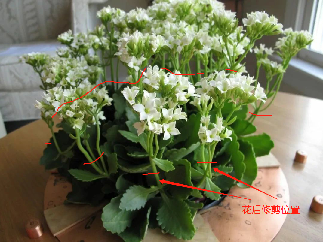 在开完花后一定要及时修剪,但不要剪得太狠,只需要将长寿花的花朵,自己花朵下面那两片特别小的叶子(托叶)去掉就可以了,基本就是将整个花茎去掉。