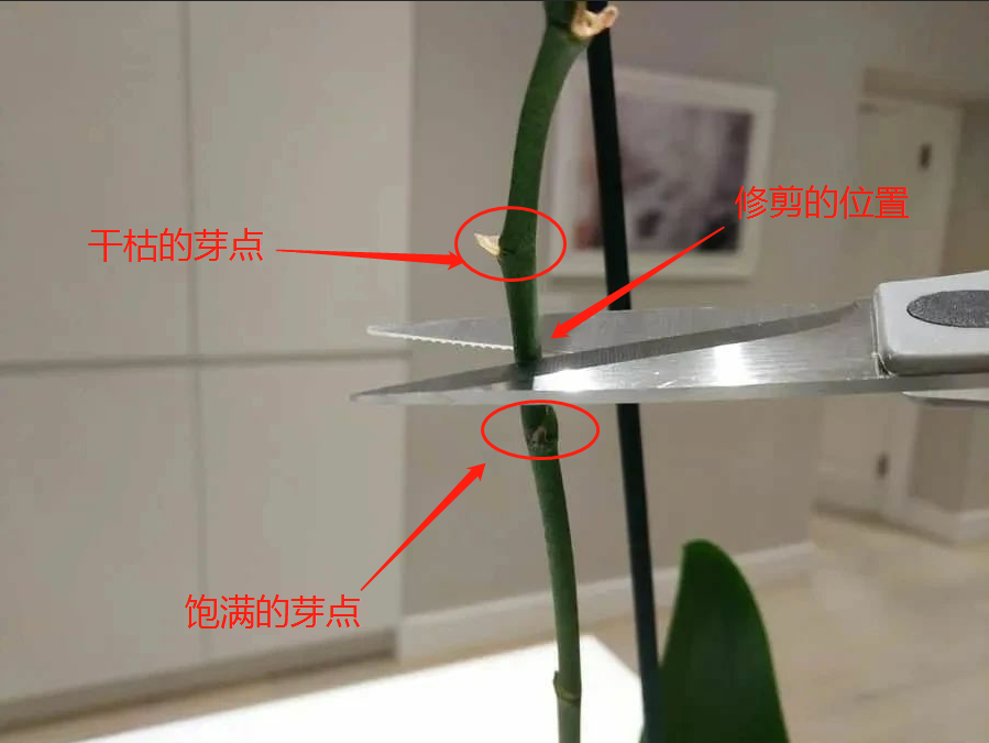 修剪的位置也很有讲究,就是仔细查看一下花梗上面的芽点,就是从开花的部分往下找,只要有芽点,就可以长出花茎。