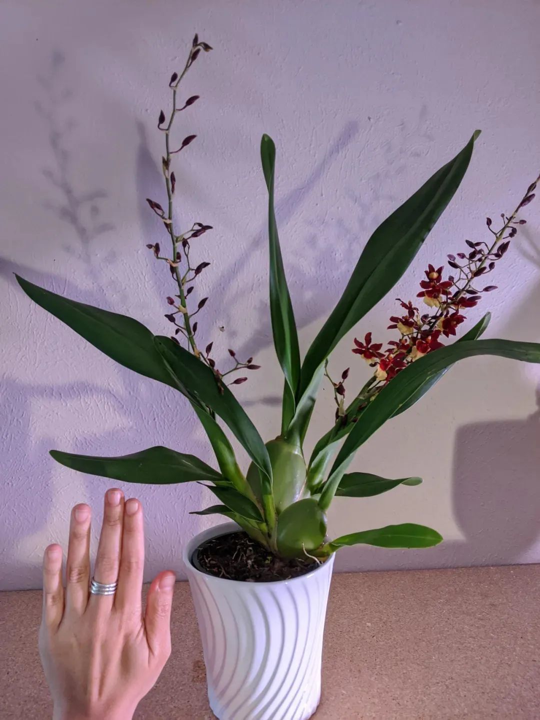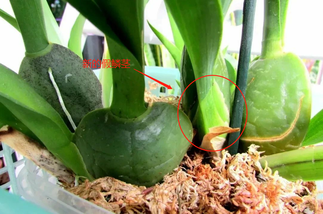 平常我们可以仔细观察文心兰根茎底部,是否有一些新的假鳞茎长出来,而老的假鳞茎就会慢慢发皱枯萎。