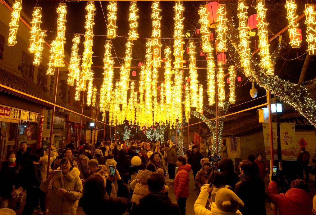 2月13日,游客在河北省石家庄市正定古城南城门景区赏灯。新华社记者 张晓峰 摄
