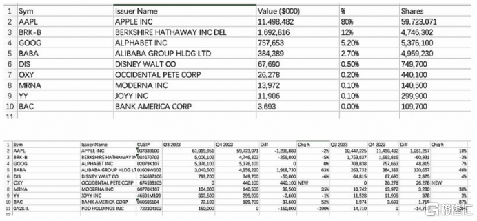 该雪球用户发帖《减持苹果,增持阿里,清仓拼多多。段永平最新13F持仓》,并上传截图显示,根据H&H International Investment, LLC提交的最新13F文件,在2023年第四季度末,该机构总共持有九家公司,“总市值144.5亿美元,前四大持仓为114.98亿美元苹果、16.92亿美元伯克希尔哈撒韦、7.57亿美元谷歌、3.84亿美元的阿里巴巴。”同时,这位雪球用户还指出,相比上一季度,H&H International Investment, LLC“新买入西方石油,增持阿里巴巴、摩德纳、美国银行,减持了苹果、伯克希尔、迪士尼和欢聚时代,清仓了拼多多。”
