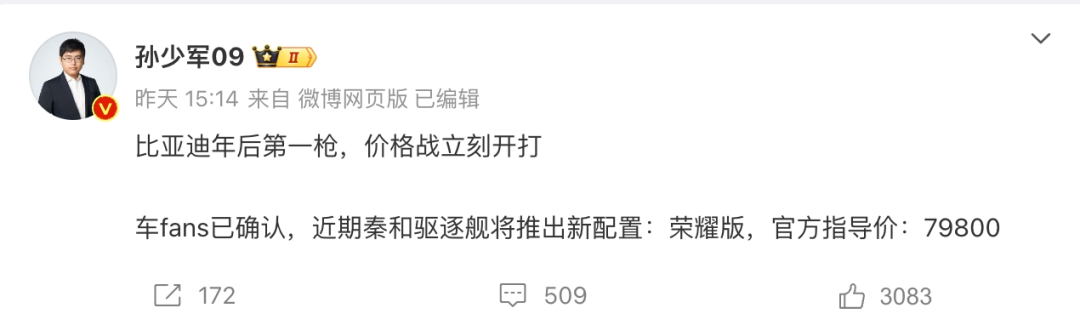 日前,汽车博主@孙少军 在微博上表示,确认比亚迪秦PLUS和驱逐舰05即将推出新配置车型“荣耀版”,官方指导价7.98万元。据推测,荣耀版车型预计将采用织物材质座椅,并对部分配置进行调整。