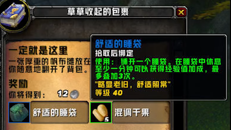 以上还都是基于理想状态下的计算,在实际游戏过程中玩家很少有机会带着睡袋BUFF连续刷2小时副本,因换人、学技能、修装备浪费的时间不计其数,而这恰恰是睡袋存在的意义。没错小编说了这么多不是为了贬低睡袋说睡袋没用,而是想说很多人都没有用好睡袋。小编在升级过程中看到太多的队伍都是5个人进本铺睡袋开始叠BUFF,在次过程中又因为有人不会、不懂、慢了、提前起床等问题耽误更多时间,最终结果还不如不睡。睡袋的正确使用时机应该是前文提到的队伍因换人、炉石回城而出现的无怪可打的那几分钟空间时间。当然睡袋任务还是很有价值做的,利用好飞机用不了多少时间,单是8颗提供双倍经验加成的混调干果就已经回本了,另外系列任务本身也能提供五位数经验。