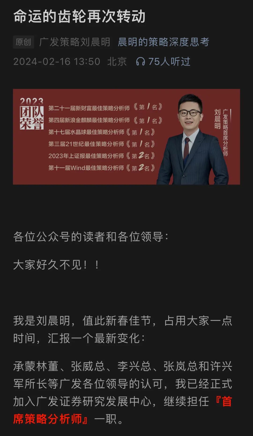 2月16日,刘晨明通过微信公众号发文官宣了上述消息。他目前在广发证券研究发展中心担任首席策略分析师。