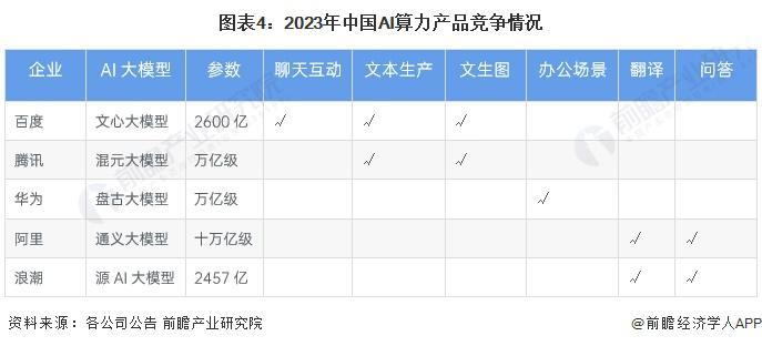 目前可以衡量国内 AI 算力竞争情况的模型有百度的文心大模型、腾讯的混元大模型、华为盘古大模型、阿里的通义大模型以及浪潮的源 AI 大模型。其中参数量最高的是阿里的通义大模型,高达十万亿级,而应用场景相对较广的是百度的文心大模型,涵盖聊天互动、文本生产以及文生图等。