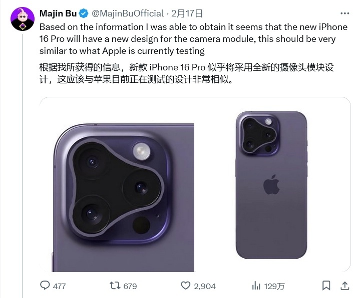 消息源 @MajinBuOfficial 近日发布推文,分享了 iPhone 16 Pro 手机的高清渲染图,展示了机身背面的全新相机岛设计,并表示该渲染图和苹果当前测试的原型机设计非常相似。