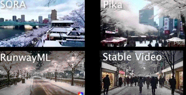 从输入相同的描述词生成的具体效果来看,Pika、Runway、Stable Video和Sora的区别非常明显。在这段同为“美丽的东京雪景熙熙攘攘。镜头穿过熙熙攘攘的城市街道,跟随几位正在享受美丽雪景和在附近摊位购物的人们。绚丽的樱花花瓣与雪花一起随风飞舞。”描述下,Sora明显是视觉上给人观感最丰富的那个,Pika和Runway的生成还是基于固定机位,静中有动的思路,仅用部分元素的动态证明生成的是视频;Stable Video的镜头是在运动的,但更像是vlog的慢放片段。
