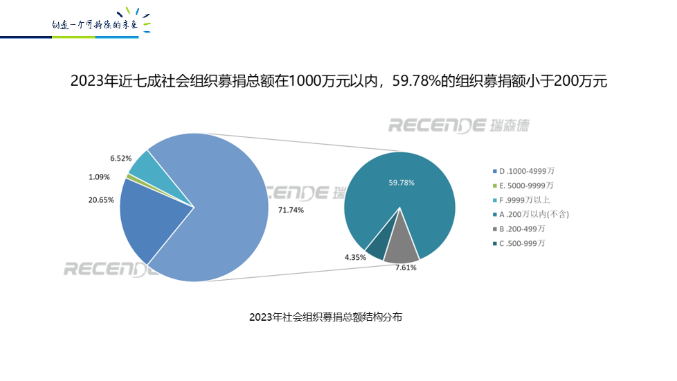 调研数据显示,2023年71.74%的社会组织募捐总额小于1000万元(不含),其中59.78%的社会组织募捐额小于200万元(不含)。