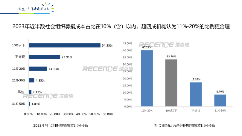 专项调研发现,2023年54.35%的社会组织募捐成本占比在10%(含)以内,23.91%的社会组织表示“说不好”。同时,有40.22%的社会组织认为募捐成本比例在11%-20%更合理;8.7%的社会组织认为如果一定要设立一个区间,这个上限应提高到30%。