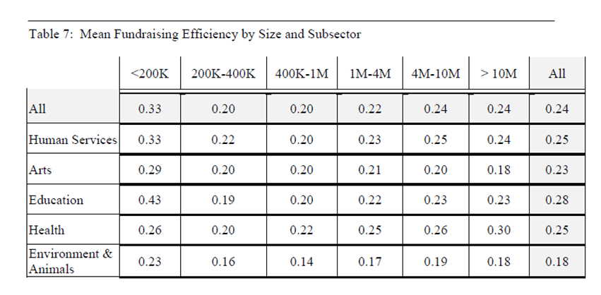 美国“全国慈善信息局”(NCIB)的统计数据显示,不同领域募捐规模的机构,募捐成本差异明显。年募捐额小于20万美元的机构,每募集1美元需要投入0.33美元;而募捐额超过1000万美元的机构,每募集1美元需要投入0.24美元。两者之间投入产出比差距达到了37.5%。