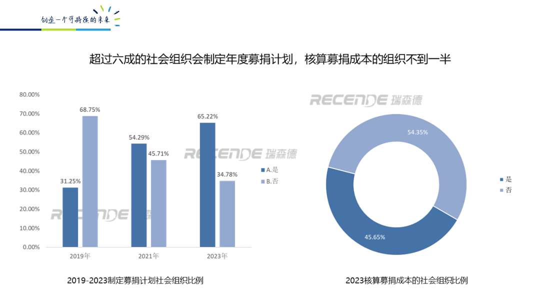 专项调研的数据显示,社会组织募捐成本主要包括:募捐活动实施、人员费用、物料设计制作等费用。2023年,仅有45.65%的社会组织进行了募捐成本核算。