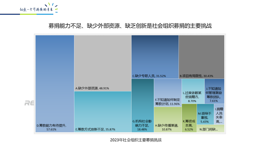 当被问及募捐面临的主要挑战时,57.61%的社会组织选择了能力有待提升,居于首位;认为“缺少外部资源”和“创新不足”紧随其后,占比分别为48.91%和35.87%。