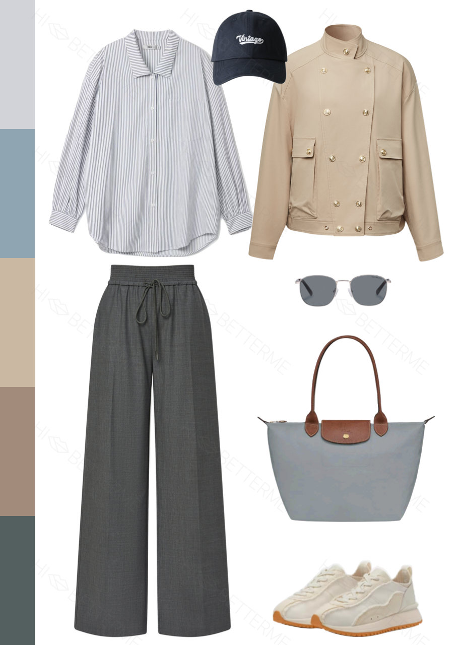 上衣我选了一件今年很火的夹克搭配宽松的条纹衬衫,都是正式感和休闲感兼具的款式,这样不管怎么穿都很有休闲自在的风格。