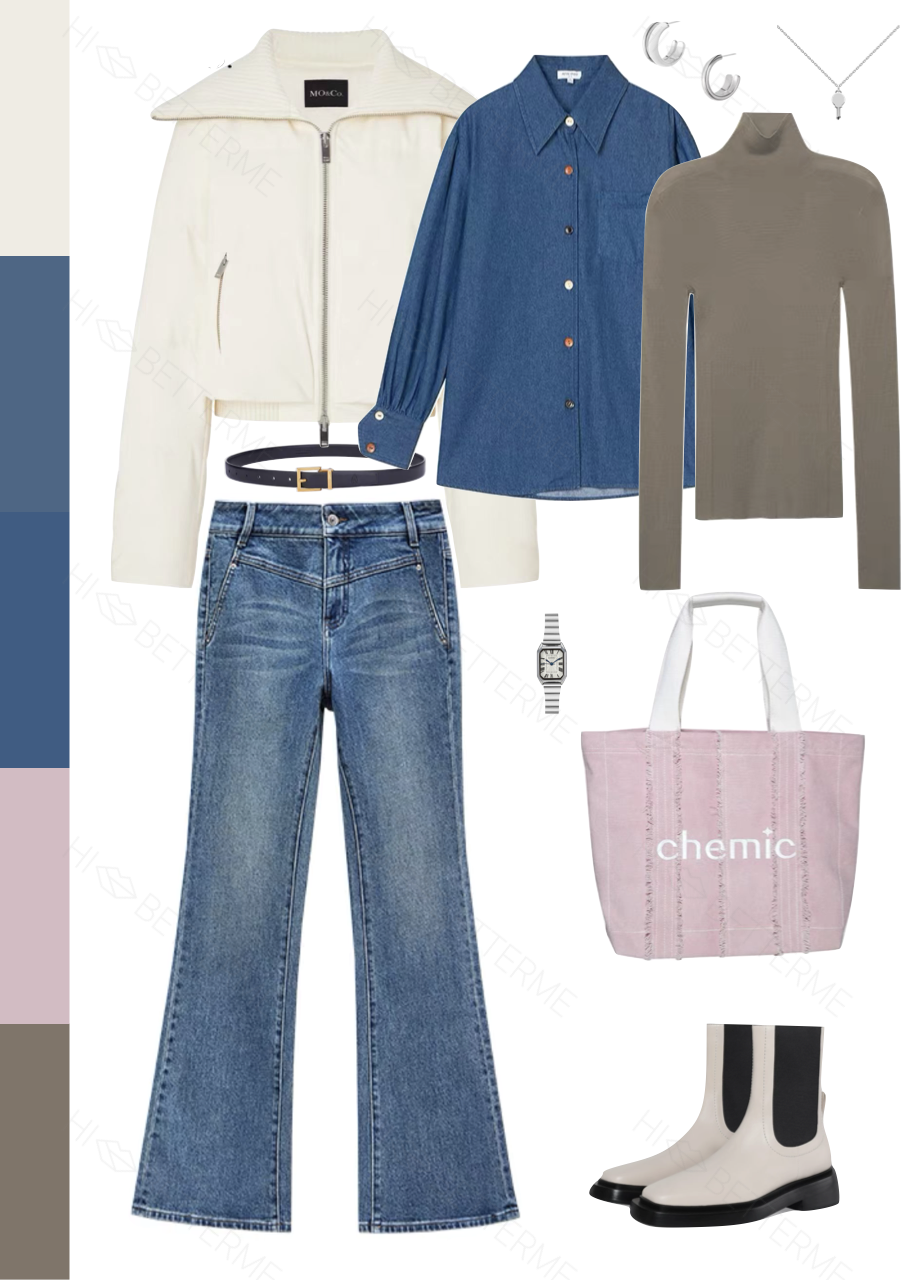 上衣我选了一件短款的翻领薄羽绒服,内搭牛仔衬衫和高领打底衫,正式感和保暖度全部拿捏。