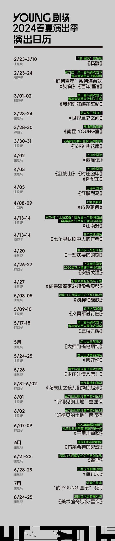 今天,YOUNG剧场2024年春夏演出季正式发布。演出季以“两宜”为主题,总计超过35台近100场类型丰富的舞台演出,展现国风与海外、传统与现代、经典与新生在剧场空间的交融,剧场在“社会大美育”计划中发挥出至关重要的作用。