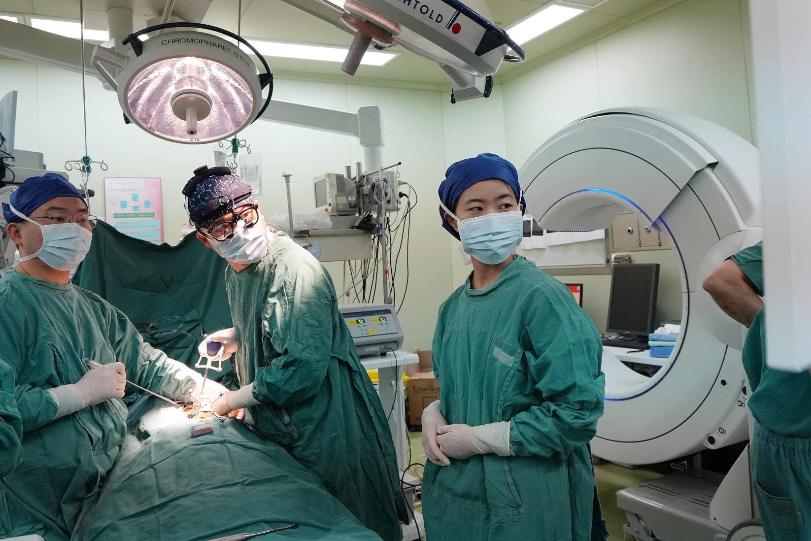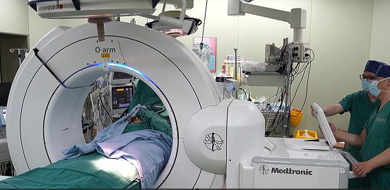 术中还可将患者放进类似电脑断层扫描影像(CT)的仪器中,用完整360度自动环型扫描取像,从而即时更正路径规划与导航,避免伤害到周围的神经血管等重要器官组织,大大提高病人手术安全、准确定位、减少病患风险及并发症的发生。